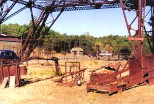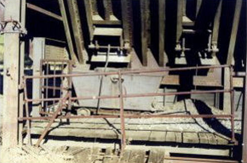 Showing a mine car that was used to move the rock to the stamp mill. And to the left showing the back of the hopper area.